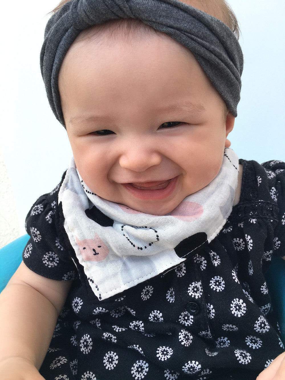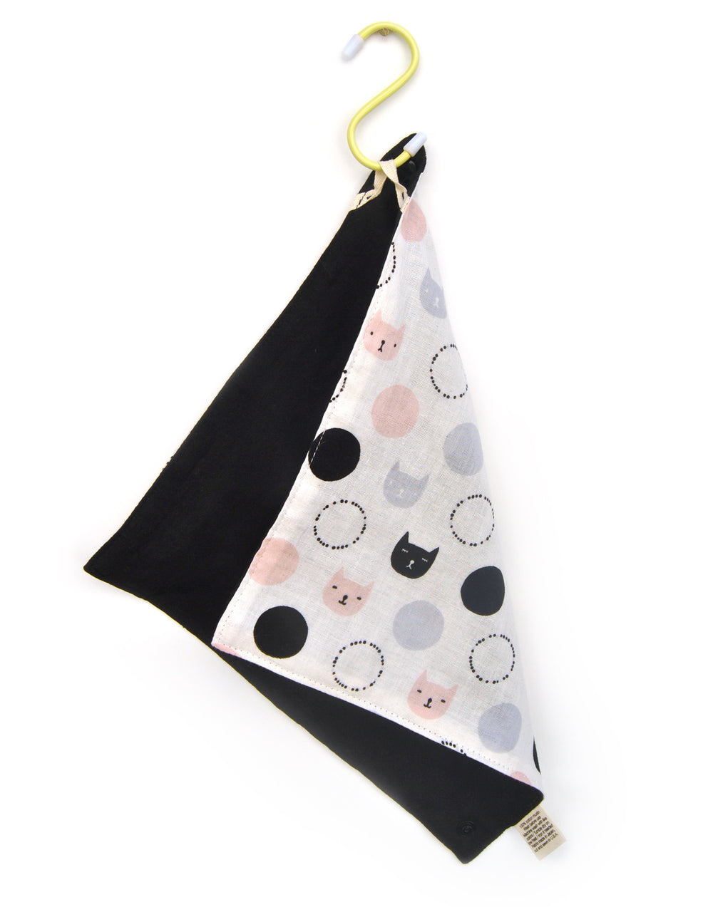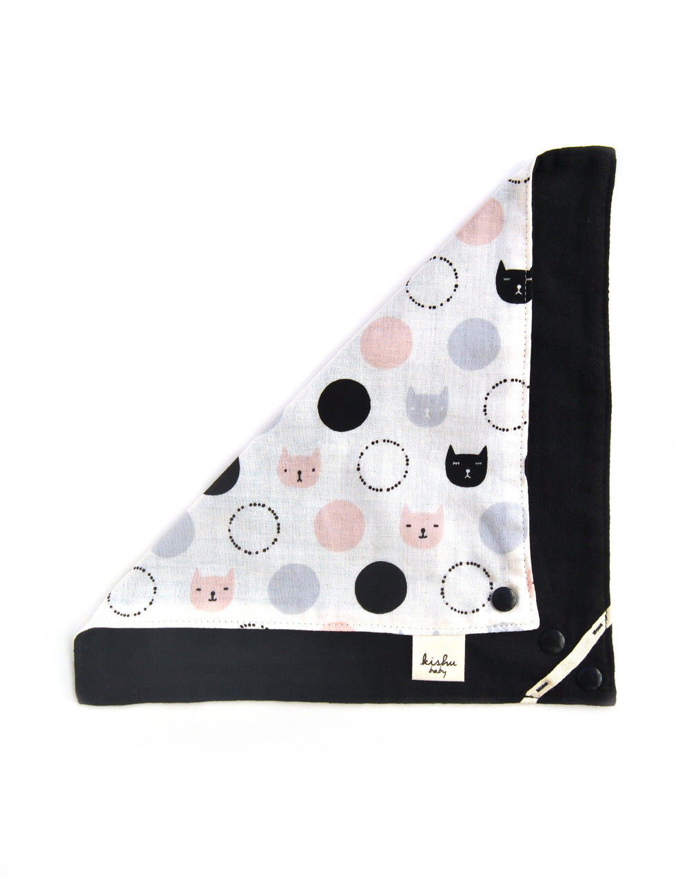 DROOL CUTER in our kitty cat bandana bib for girls! Reversible so you can enjoy 2 styles in one bib. Made in the USA from premium imported Japanese muslin. Soft, lightweight, breathable, durable. 2 KAM snaps for adjustable neck size. One size fits most (3 to 24 months).