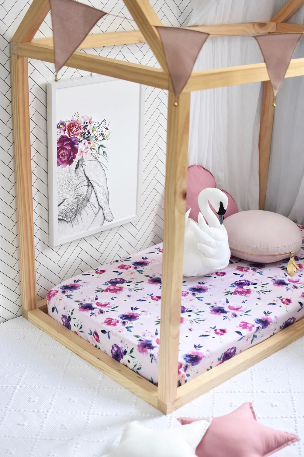 Our Floral Kiss fitted cot sheet is made from snuggly soft stretch cotton jersey. Comes with a matching drawstring bag which can be used for other multi-purposes.